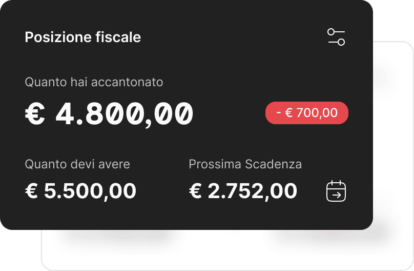 Imposta i tuoi accantonamenti basandoti su coefficiente di redditività e aliquota (5% o 15%). Forfolio calcola in automatico anche gli acconti futuri stimati sul tuo fatturato precedente.