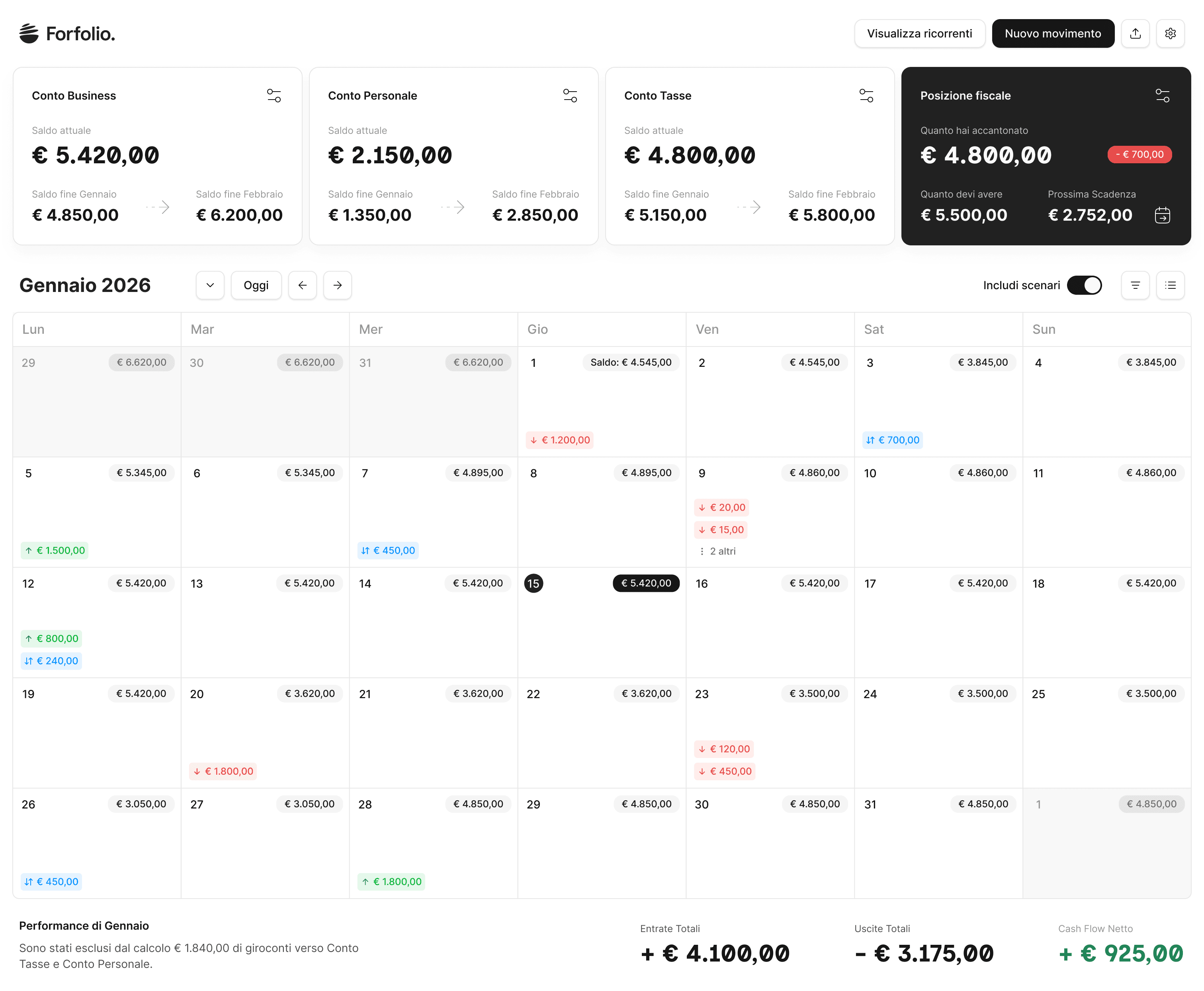 Abbiamo creato Forfolio per aiutarti a vedere cosa succede al saldo prima che succeda. Non è magia, è pianificazione: metti in ordine i flussi, proietta le tue prossime settimane e torna a dormire sereno. Perché l'incertezza è parte del gioco, ma non deve essere il tuo incubo.