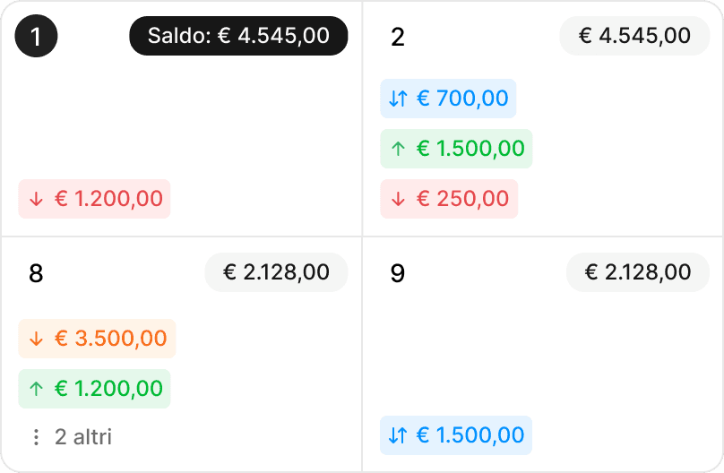 Il calendario mostra come cambierà il saldo nel tempo. Aggiungi movimenti futuri e sai in anticipo quando “stringere” o quando puoi permetterti di spendere.